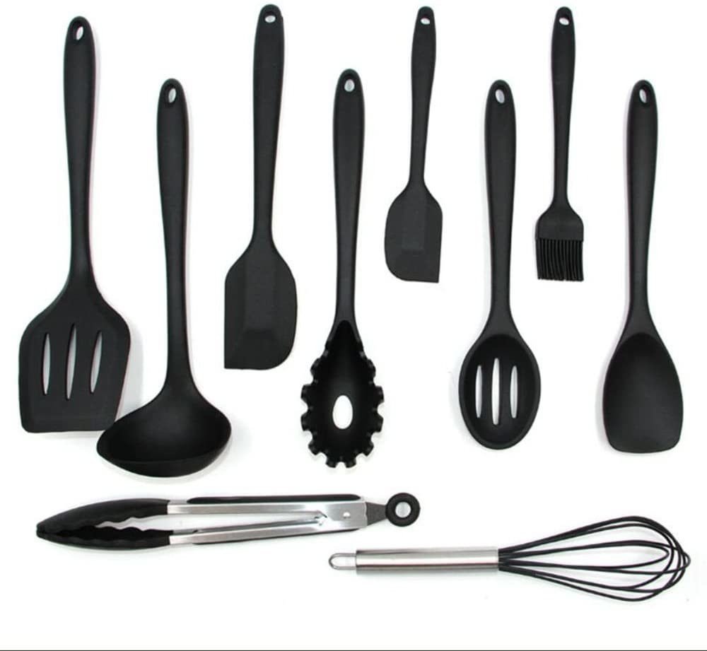 3.COMPLETE COOKING UTENSILS SET COVERS ALL KITCHEN NEEDS:10 PIECES Silicone Utensil Set, best Kitchen helper for all kinds of foods and cooking, including whisk, brush, large scraper, small scraper, spoon, kitchen tongs, drain shovel, powder catch, butter spatula, drain spoon.