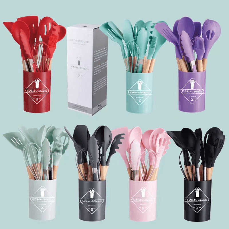 11pcs Wooden Handle Silicone Kitchen Utensils Set Storage Bucket Non-stick Shovel Spoon Cooking Kitchen Utensils 11 Pieces Set Silicone Shovel Spoon
