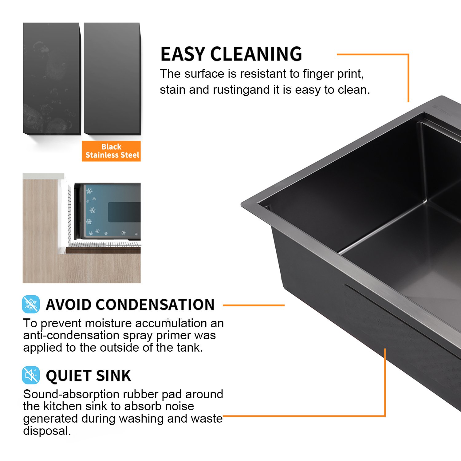 3.Handcrafted with premium 304 series stainless steel, fully undercoated with multi-layer sound-eliminating pad, which also prevents condensation.