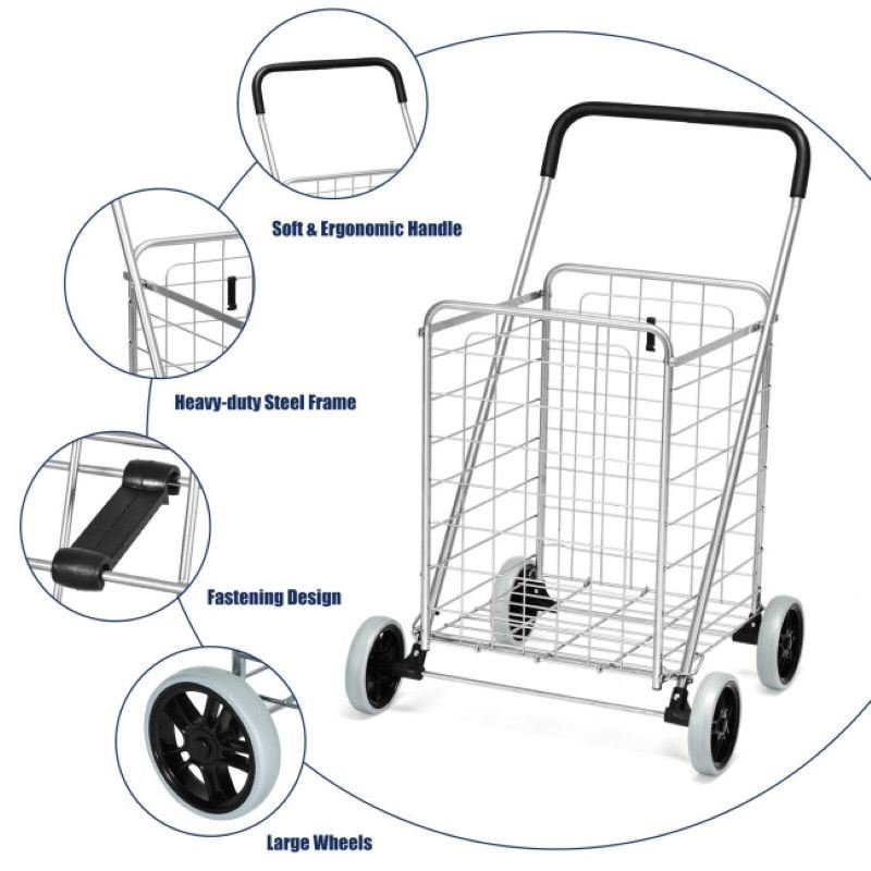 Upgraded Steel Frame and Super Loading Capacity: Made of heavy-duty steel material, this shopping cart is carefully crafted to ensure rust resistance and long-term use. Thanks to the sturdy structure, it has a strong load-bearing capacity of 100 lbs.