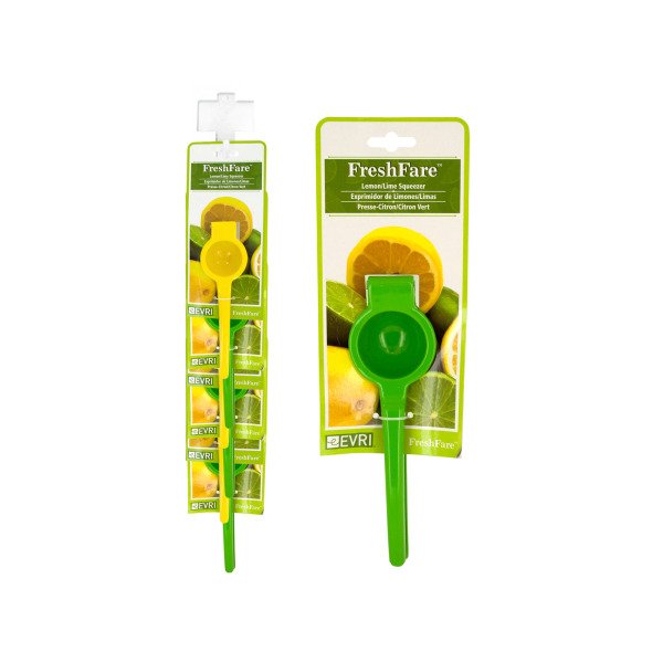 Easily juice citrus fruits with this Lemon & Lime Squeezer featuring a durable metal squeezer in bright colors with a pulp and seed catcher. Simply cut lemon or lime in half and place fruit in the juicer. Lower the top of the juicer onto the fruit, applying pressure to release juice. Comes in assorted colors. Clip strip comes with 6 pieces.