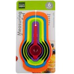 Ideal for baking, this 6-piece Nesting Measuring Spoon Set features colorful measuring spoons made of durable plastic. Spoons nest together for easy storage. Includes six measuring spoons in convenient assorted sizes. Includes measuring spoon sizes: 1/2 tablespoon, 1 tablespoon, 1/4 cup, 1/3 cup, 1/2 cup and 1 cup. Dishwasher safe. Comes packaged to a hanging panel. ,Nesting Measuring Spoon Set,