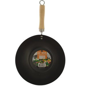 Prepare food to perfection with this All Purpose Wok featuring a round metal pan with ribbed texture walls, an easy to clean coated surface and a comfortable, contoured wooden handle. Not just for stir frying, this wok can be used for shallow or deep frying, steaming and simmering foods. Handle has a hang hole for easy storage. Wok measures approximately 9.875" in diameter x 3" deep with a 6.75" long handle. Comes loose.,All Purpose Wok with Wood Handle,