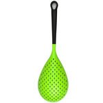 Great for scooping and serving your favorite foods, this Strainer Scoop features a durable plastic tool with a large perforated scooper end to strain out liquids and a comfortable handle with a hanging hole for easy storage. Scoop is heat-resistant to 400 degrees Fahrenheit. Measures approximately 15" long with a 4.625" wide scooper. BPA free. Dishwasher safe. Comes packaged with a hanging panel.,Strainer Scoop,