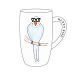 This is the perfect mug to remind you to keep up with your studies, or to help you pull that all-nighter before your test! It puts a special twist on a common phrase, the early bird gets the worm, as in this case, the NERDY bird gets the worm! The mug is white and features a handle with "nerdy bird" written on it in fine black print. On the front, there's a bluebird wearing black glasses on a bright orange beak, sitting on a branch.,Nerdy Bird Latte Mug,