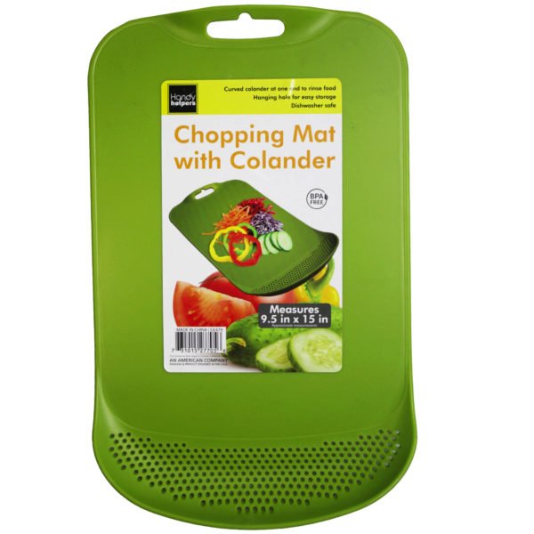 Ideal for cutting vegetables, fruits, or meats, this BPA-free 2-in-1 Chopping Mat features an innovative design that allows the transfer of chopped items quickly without spilling. Mats are non-absorbent and non-porous. They help protect countertops and keep knives from dulling. These mats even feature a curved colander at the bottom to clean fruits/vegetables before cutting them, how nifty! Mats are made of plastic. Each mat measures approximately 9.5" x 15". Comes packaged alone with a stick-on label attached. The chopping board has a built-in hanger for easy storage. The product is dishwasher safe. ,Chopping Board w/Colander,