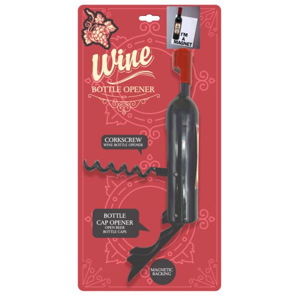 The perfect tool for wine enthusiasts and kitchen aficionados alike. This unique and versatile device combines functionality with aesthetics, making it a must-have addition to your kitchen or barware collection. Its functional design, dual capabilities, and eye-catching appearance make it a delightful addition to any home. Features: Magnetic Backing. Wine Bottle Shaped Corkscrew and Can Opener measures approximately 4 1/2" long.,Wine Bottle Shaped Corkscrew and Can Opener,