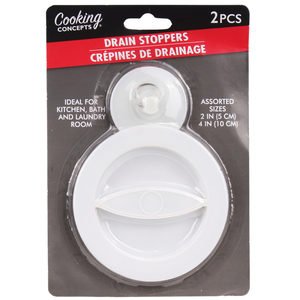 Keep sinks free from clogs and leaks with these 2-pack White Sink Drain Stoppers. This versatile set includes a 2-inch and a 4-inch stopper, providing a perfect fit for various sink sizes in your kitchen, bathroom, or laundry room. Made from durable materials, these stoppers are designed to create a tight seal, preventing water from draining when you don’t want it to. Includes two drain stoppers (2" and 4"), ideal for different sink sizes and uses. Designed to create a watertight seal, preventing water from draining and keeping sinks full as needed. The clean white finish blends seamlessly with most sink designs and decors. Comes packaged inside a hanging blister card.,2 Pack 2" and 4" Sink Drain Stoppers,