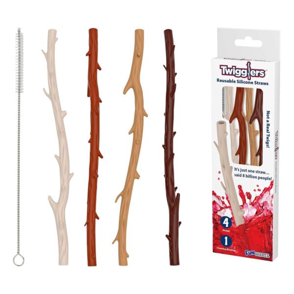 A 4 pack of Reusable Silicone Straws that are Autumn colors. Even though designed to look like twigs, they are not real twigs!. The set comes with a cleaning brush allowing for reusing. No longer waste plastic or paper straws. Comes in a hanging box. ,Twigglers Reusable Silicone Straws 4 Pack With Cleaning Brush,