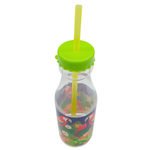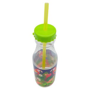 Feel like you're in the tropics? You will when your drinking out of our Luau Water Bottle with Straw. Decorated with colorful luscious forest foliage and beautiful parrots. This reusable bottle has a bright green bottle cap style lid with a yellow straw. Comes loose.,Luau Water Bottle with Straw,