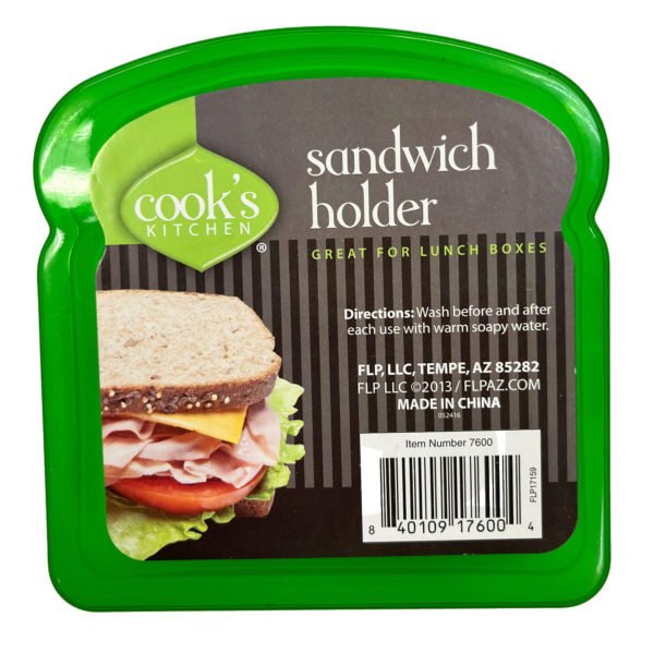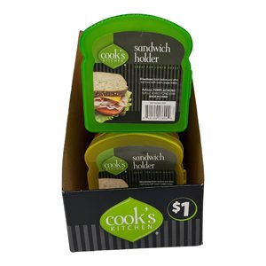 Great for picnics or just storing, use the Cooks Kitchen Sandwich Holder to keep a lunch sandwich fresh. Easy clean with warm soapy water. Reusable but should wash before use. Comes in assorted colors in a PDQ display. ,Cooks Kitchen Sandwich Holder in Assorted Colors in PDQ Display,